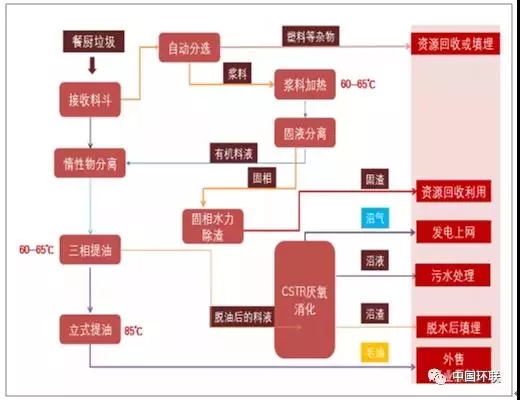 餐廚垃圾的特點包括有機物含量高,含水率高,易腐爛變質(zhì),易發(fā)酵、發(fā)臭,主要是采用厭氧消化、好氧堆肥和飼料化工藝等生物法進(jìn)行處理。其中厭氧消化工藝能最大化回收油脂,無害化程度高,并能夠充分地對餐廚垃圾中的有機物進(jìn)行資源化回收和利用,已經(jīng)有超過70%的餐廚垃圾處理項目使用這條技術(shù)路線,是現(xiàn)階段的主流工藝路線。