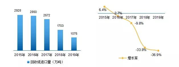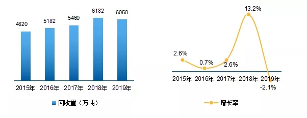 圖3 2015-2019年我國廢紙回收量及增長速度