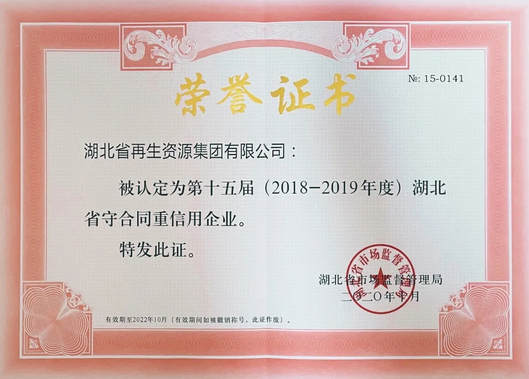 日前,湖北省市場監(jiān)督管理局向社會公示了第十五屆(2018-2019年度)“守合同重信用”企業(yè)名單,湖北省再生資源集團(tuán)有限公司入選榜單。